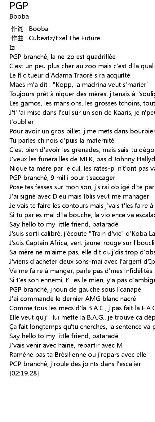 | [01:08.09] | PGP branché, 9 milli pour t'saccager |