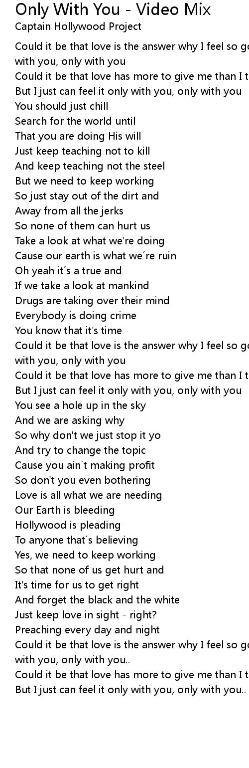 | Could it be that love is the answer why I feel so good, why I want to stay here with you, only with you.. | |