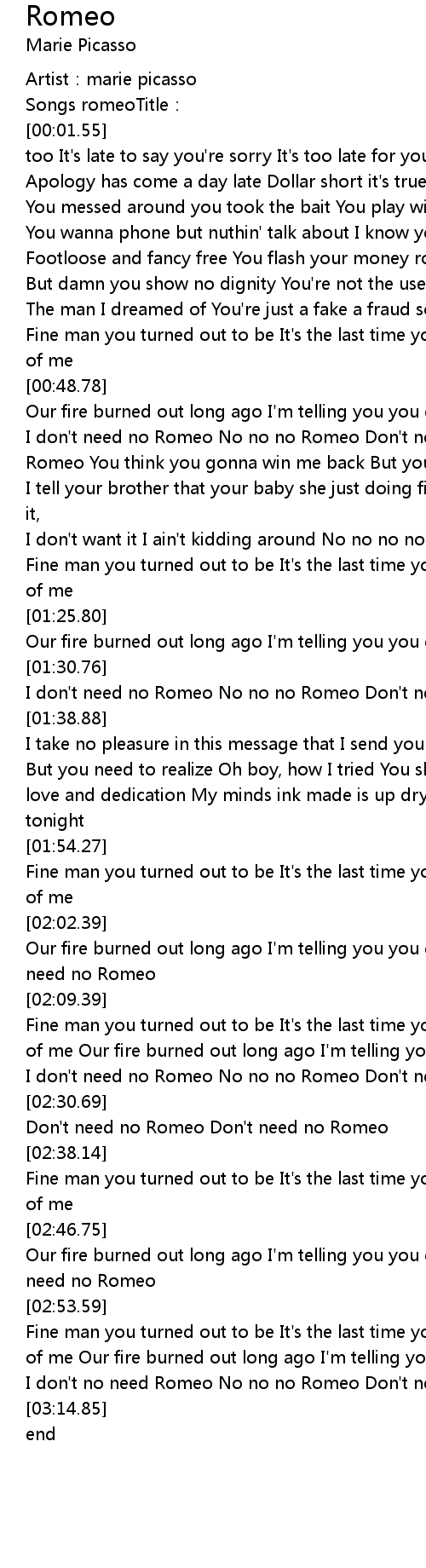 | [02:03.02] | Our fire burned out long ago I' m telling you you gotta know I don' t need no Romeo |