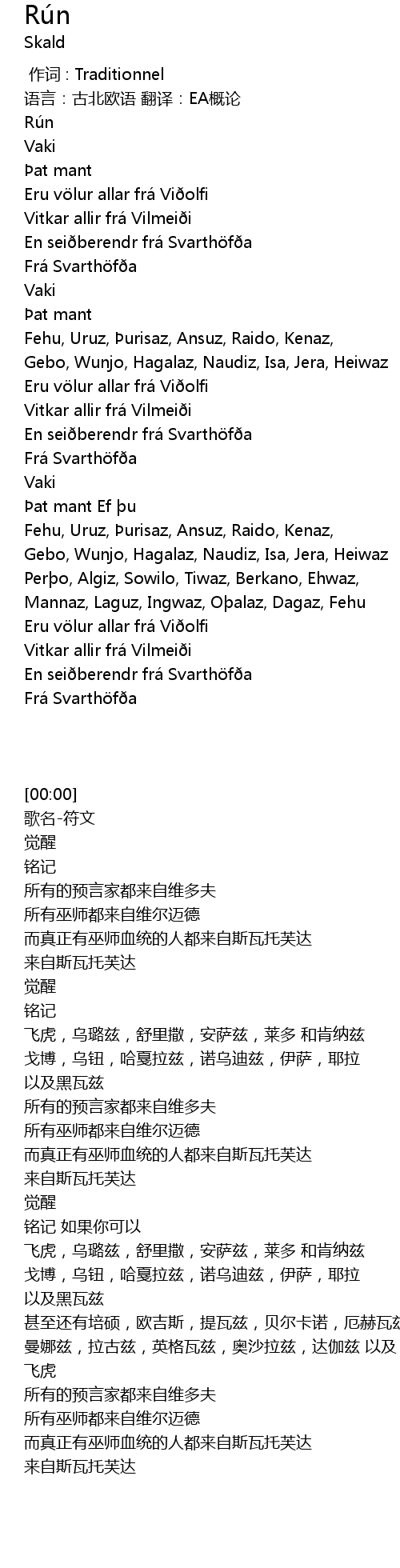 | [00:34] | Fehu, Uruz, urisaz, Ansuz, Raido, Kenaz, |