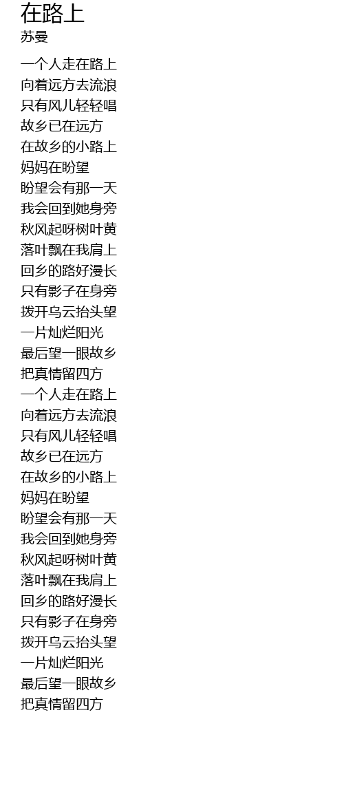 | [00:53.240] | zài gù xiāng de xiǎo lù shàng |