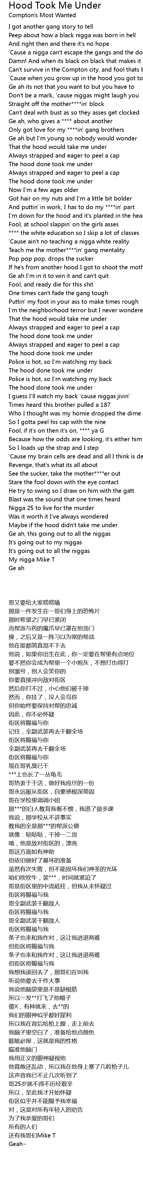 The hood done took me under |