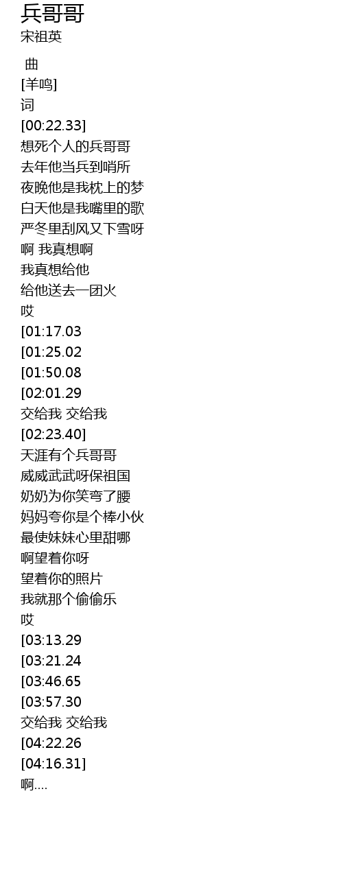 | [03:30.46][03:13.29] | 兵哥哥啊兵哥哥 |