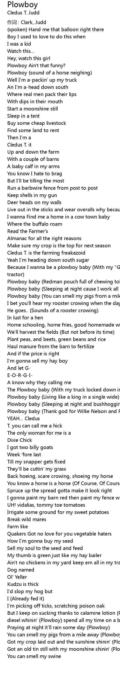 | But I keep on sucking thanks to calamine lotion Plowboy got a 4230 with my diesel whinin' Plowboy spend all my time on a big combine plowboy | |