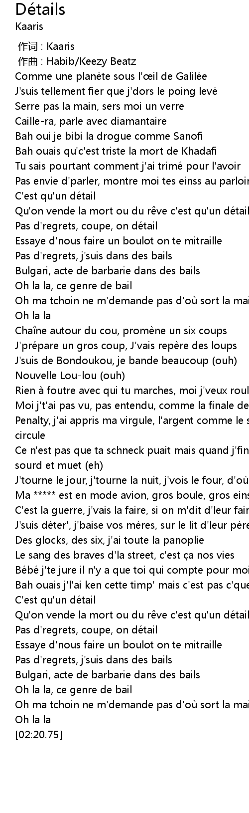 | [00:43.58] | Pas d'regrets, coupe, on détail |