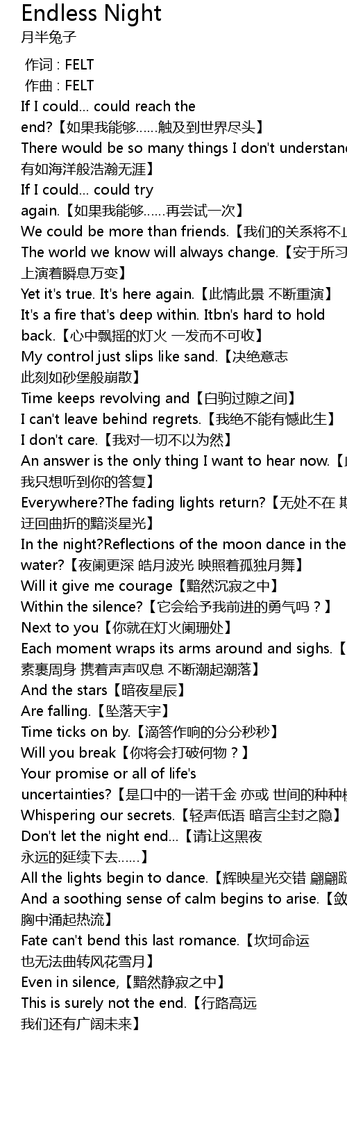 | [03:06.944] | Don't let the night end...【请让这黑夜 永远的延续下去……】 |
