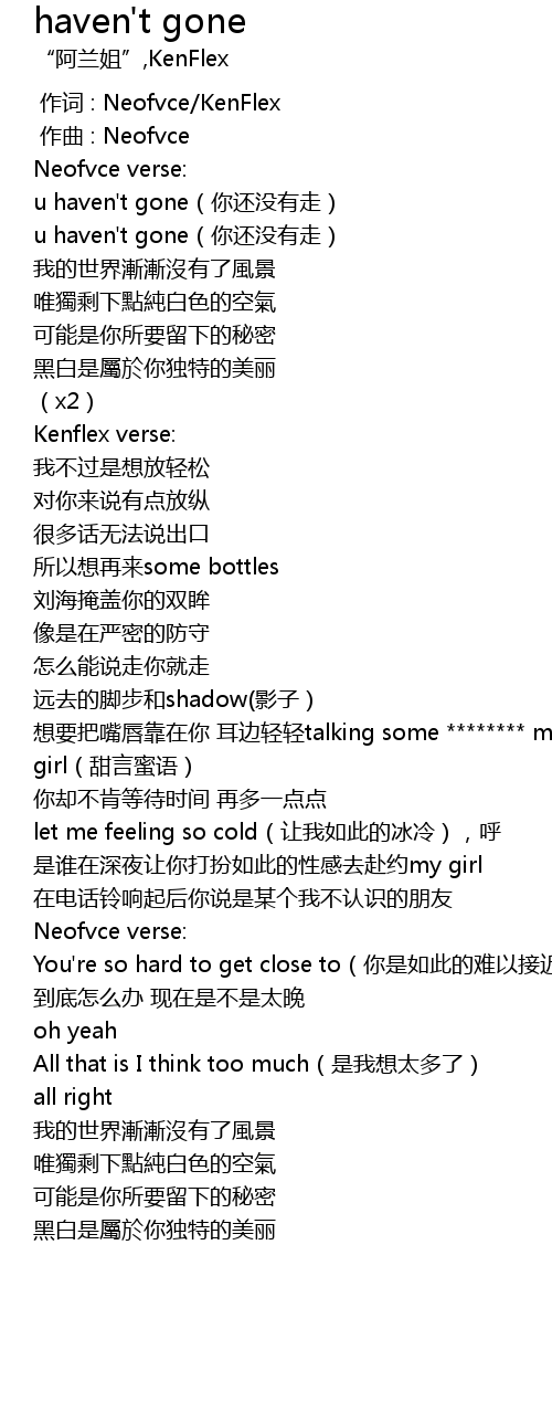 | [00:36.710] | u haven't gone(你还没有走) |