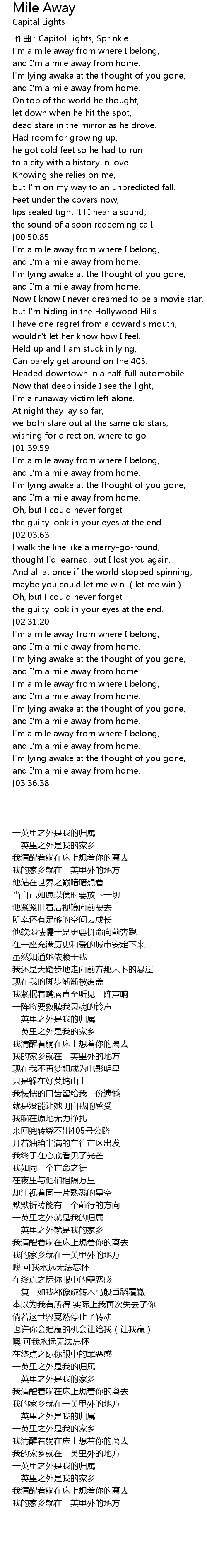 | [03:03.14] | I'm a mile away from where I belong, |