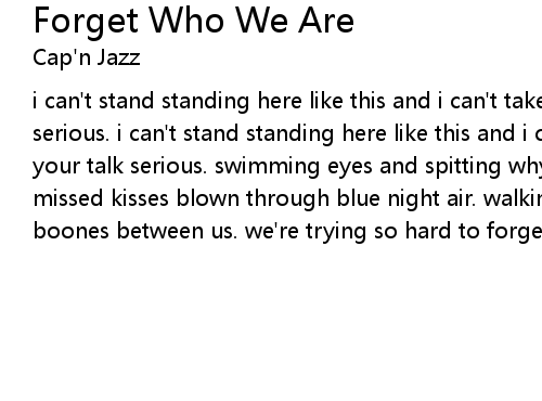 | i can't stand standing here like this and i can't take taking any of this talk serious. i can't stand standing here like this and i can't take taking any of your talk serious. swimming eyes and spitting whys splitting ties we realize. missed kisses blown through blue night air. walking you home with a bottle of boones between us. we're trying so hard to forget who we are. |