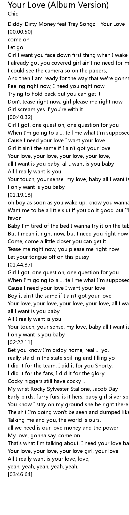 | [03:06.54] | That' s what I' m talking about, I need your love baby, come on |
