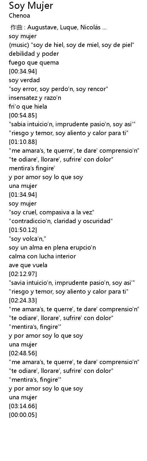 | [00:22.22] | (music) "soy de hiel, soy de miel, soy de piel" |