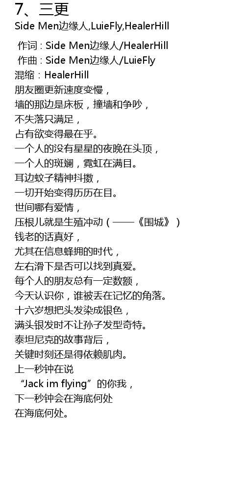| [00:00.000] | 作词 : Side Men边缘人/HealerHill |