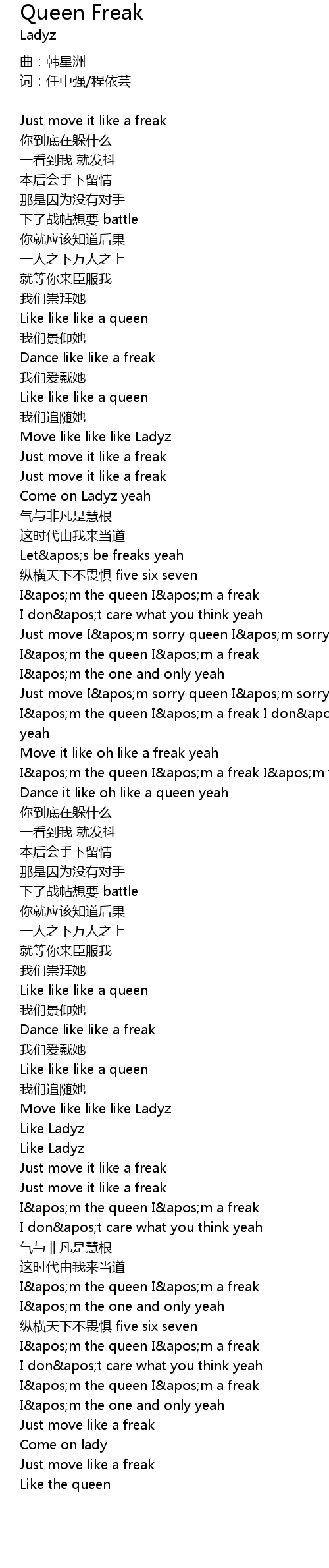 | I apos 59 m the queen I apos 59 m a freak I apos 59 m the one and only yeah | |
