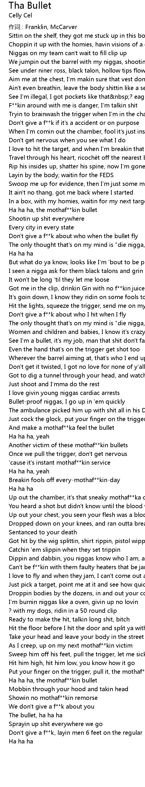 | Put your finger on the trigger, pull it, the mothaf**kin bullet | |