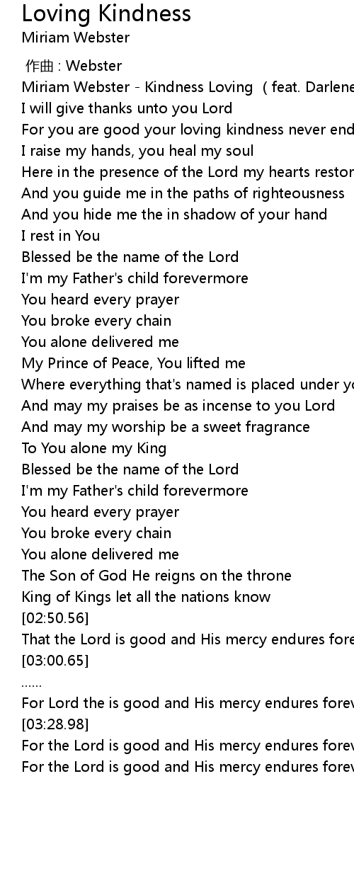 | [00:02.64] | Miriam Webster Kindness Loving feat. Darlene Zschech |