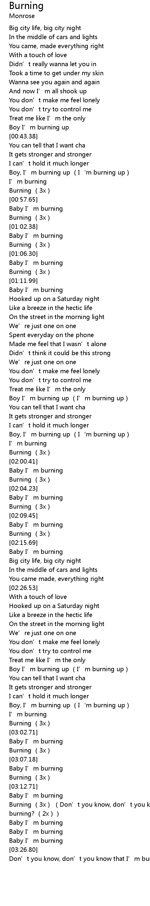 | [03:17.18] | Burning 3x Don' t you know, don' t you know that I' m burning? 2x |