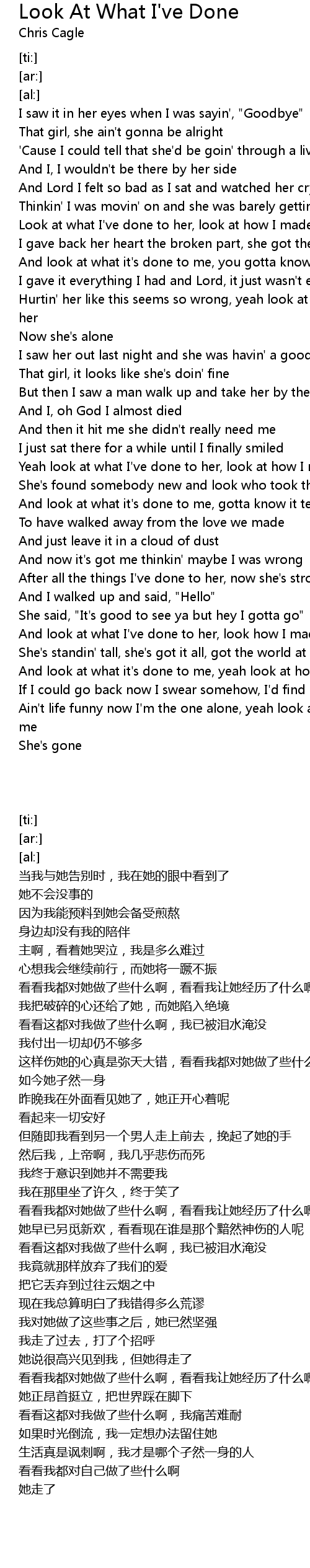 Hurtin' her like this seems so wrong, yeah look at what I've done to her |