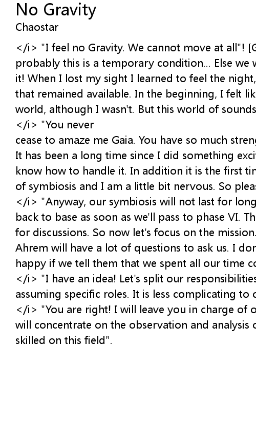 | [Mayon O:]</i> "I feel no Gravity. We cannot move at all"! [Gaia:]</i> "Relax, probably this is a temporary condition... Else we will just have to get use to it! When I lost my sight I learned to feel the night, depending on the senses that remained available. In the beginning, I felt like I was inside a different world, although I wasn't. But this world of sounds, smells, temperatures and material objects was not as frightening as I thought." [Mayon O:]</i> "You never cease to amaze me Gaia. You have so much strength inside you. I must apologize. It has been a long time since I did something exciting in my life and I don't know how to handle it. In addition it is the first time I experience this kind of symbiosis and I am a little bit nervous. So please don't be a harsh judge". [Gaia:]</i> "Anyway, our symbiosis will not last for long. Cendor will bring us back to base as soon as we'll pass to phase VI. Then we will have all the time for discussions. So now let's focus on the mission. I am sure the people of Ahrem will have a lot of questions to ask us. I don't think they are going to be happy if we tell them that we spent all our time communicating instead of exploring". [Mayon O:]</i> "I have an idea! Let's split our responsibilities assuming specific roles. It is less complicating to concentrate on one thing a time." [Gaya:]</i> "You are right! I will leave you in charge of our movement. I will concentrate on the observation and analysis of the situation. I am really skilled on this field". |