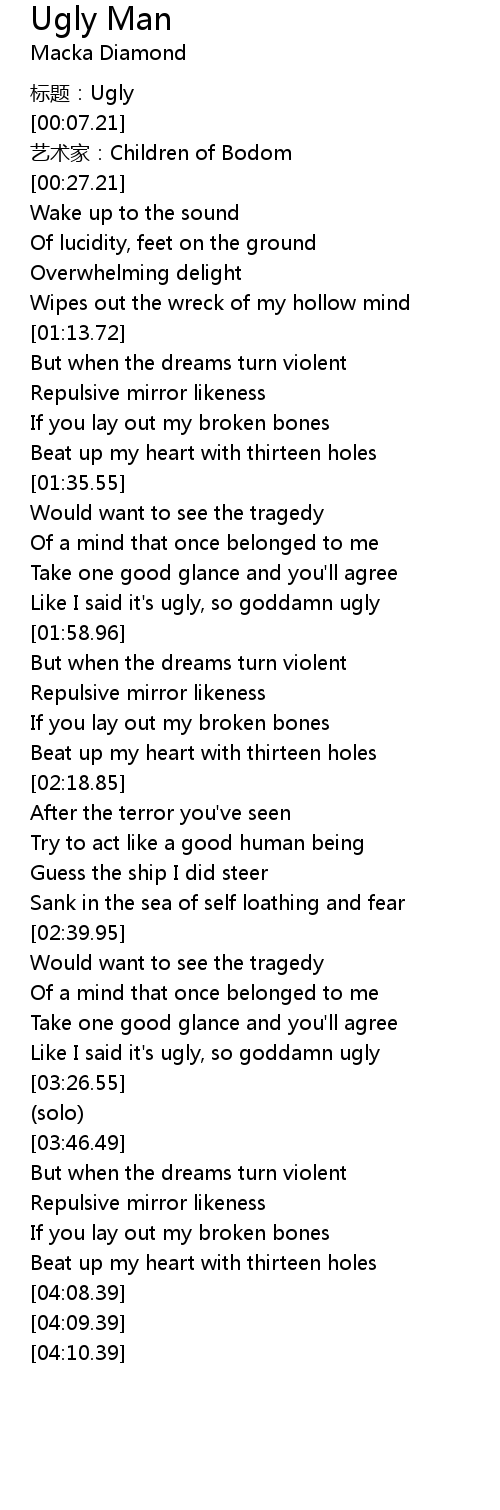 | [03:21.65] | Like I said it' s ugly, so goddamn ugly |