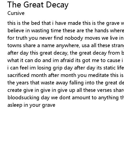 this is the bed that i have made this is the grave where i will lay i dont believe in wasting time these are the hands where i will bury my face searching for truth you never find nobody moves we live in the great decay all these ghost towns share a name anywhere, usa all these strangers look the same day after day after day this great decay, the great decay from birth to the grave and ive seen what it can do and im afraid its got me to cause i can feel it suck me in cause i can feel im losing grip day after day its static life week after week is sacrificed month after month you meditate this is the life that i embrace all of the years that waste away falling into the great decay this is the world that i create give in give in give up all these verses share a theme its the day after bloodsucking day we dont amount to anything this great decay, this great decay asleep in your grave |