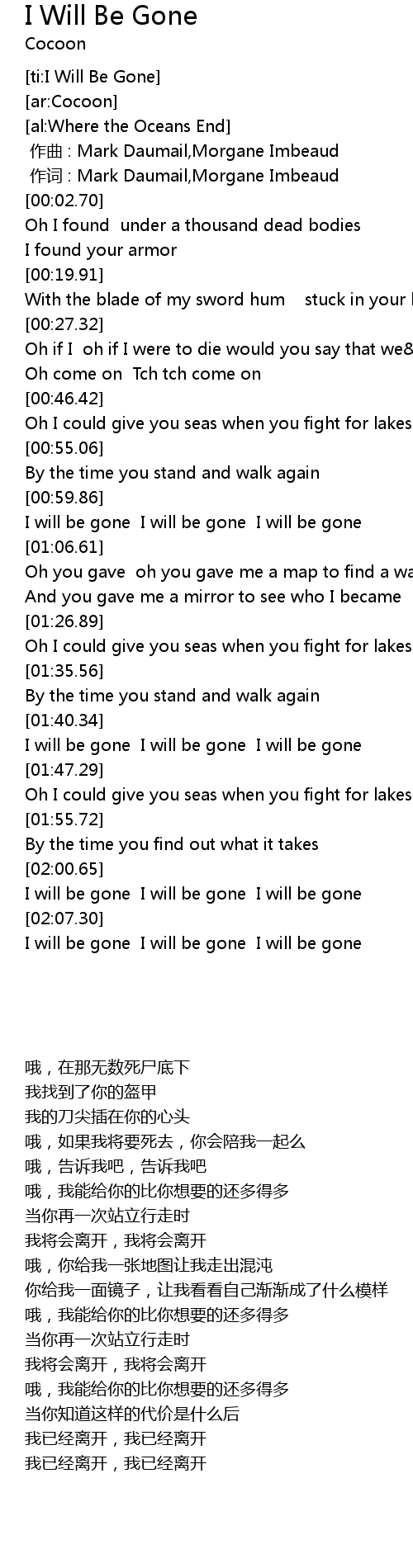 | [02:11.44] | I will be gone I will be gone I will be gone |