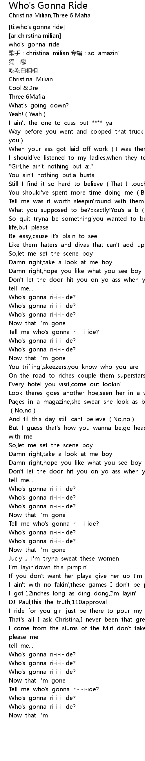 | [01:24.43] | Tell me who' s gonna riiiide? |