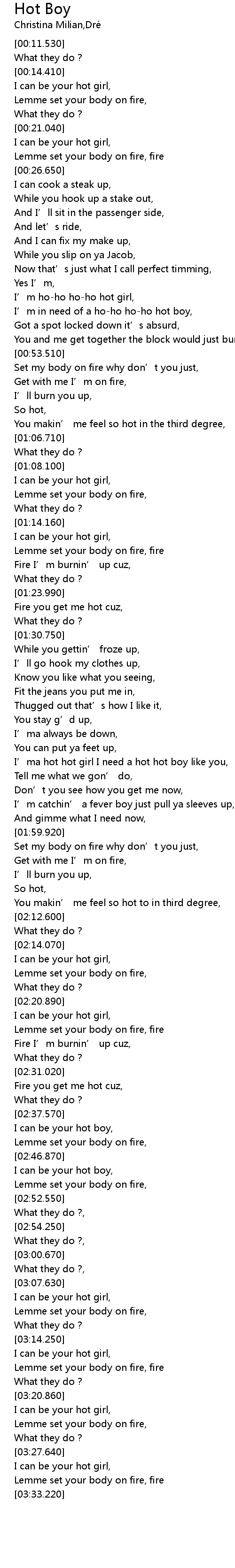 | [01:46.850] | I' ma hot hot girl I need a hot hot boy like you, |