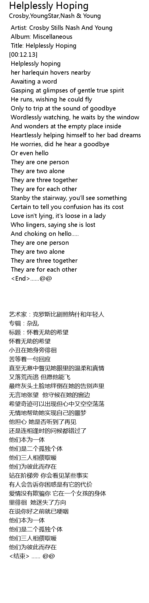 | [00:13.37] | Helplessly hoping |