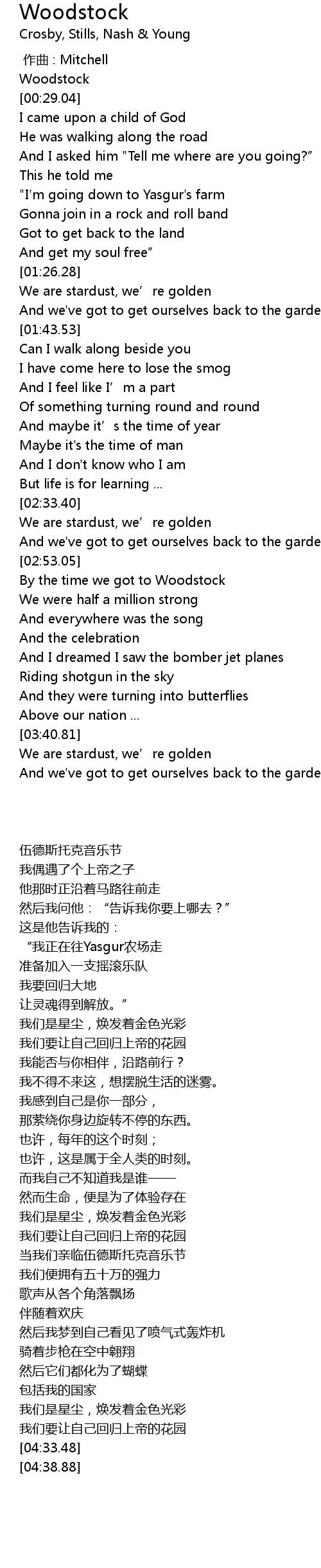 | [03:00.36] | By the time we got to Woodstock |