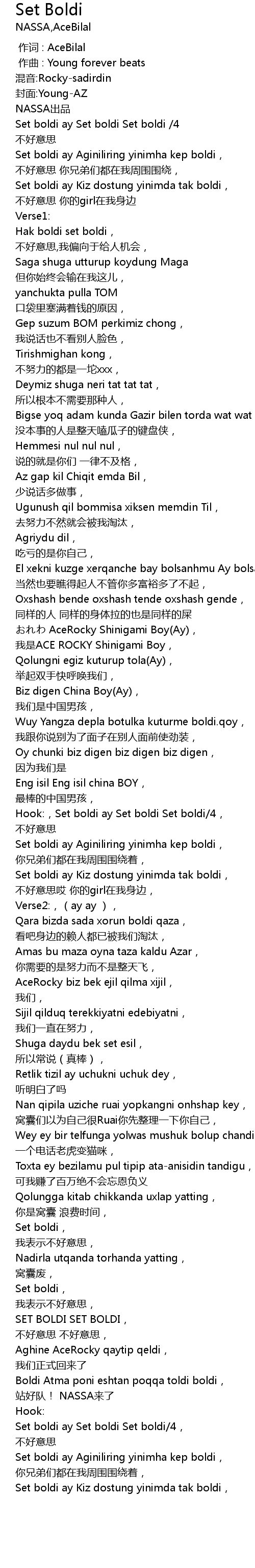 | [01:29.698] | Hook:,Set boldi ay Set boldi Set boldi/4, |