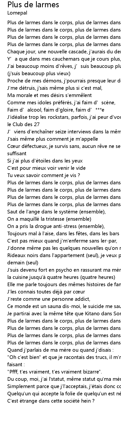 | [01:26.57] | Plus de larmes dans le corps, plus de larmes dans le corps |