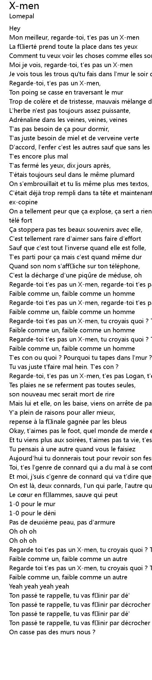 | [02:51.87] | Regarde toi t' es pas un Xmen, tu croyais quoi ? T' es pas un Xmen |
