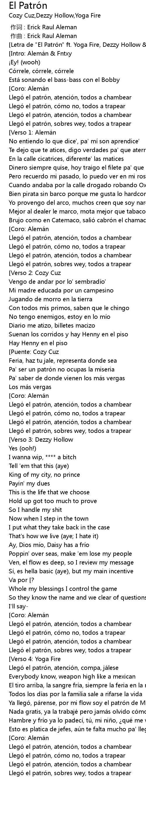 | [00:00.000][Letra de "El Patrón" ft. Yoga Fire, Dezzy Hollow & Cozy Cuz] | |
