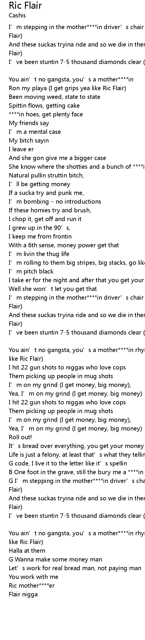 | You ain' t no gangsta, you' s a mother in rhyme my playa I get grips yea like Ric Flair | |