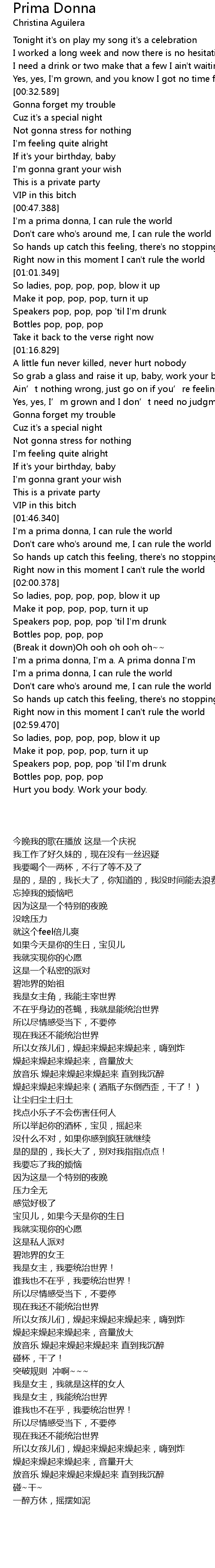 | [02:23.250] | I' m a prima donna, I' m a. A prima donna I' m |