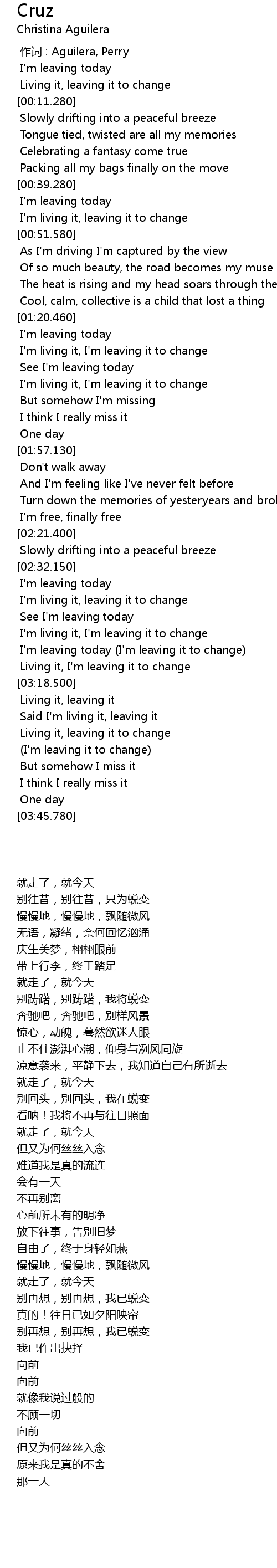 | [03:07.500] | I' m leaving today I' m leaving it to change |