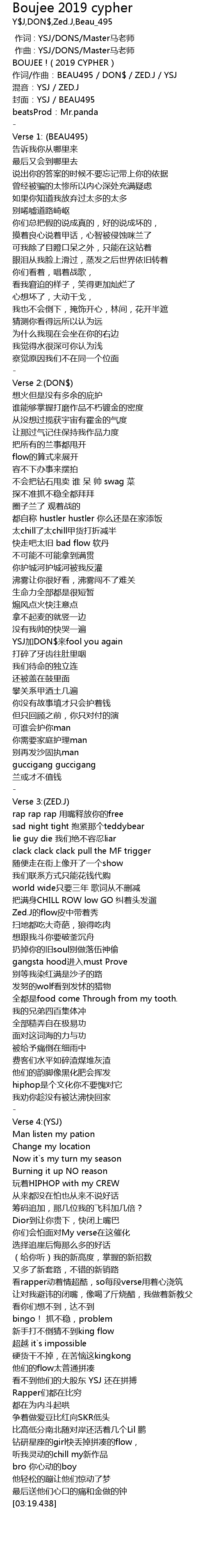 | [00:05.068] | 作词/作曲:BEAU495 / DON$ / ZED.J / YSJ |