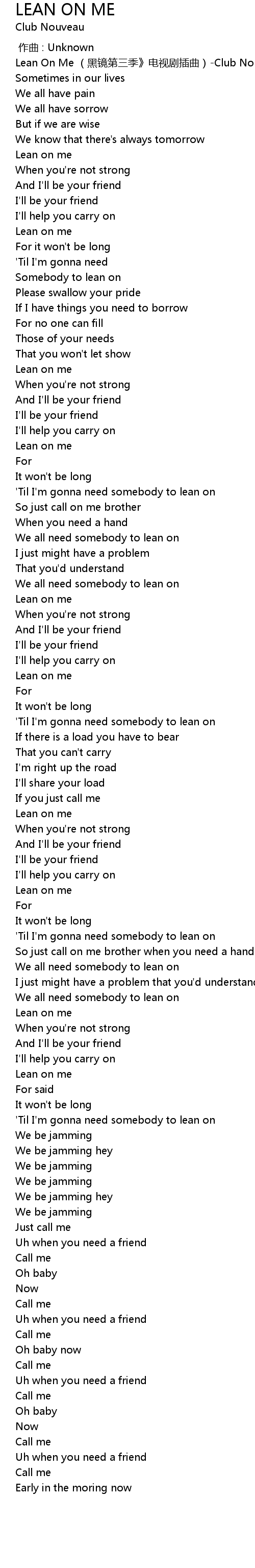 | [00:00.00] | Lean On Me (黑镜第三季》电视剧插曲)-Club Nouveau |