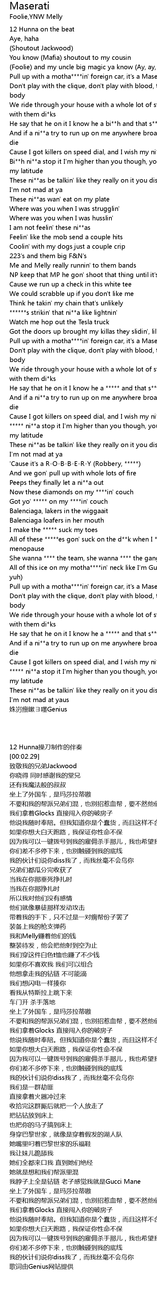 | [00:16.83] | Pull up with a motha****in' foreign car, it's a Maserati |