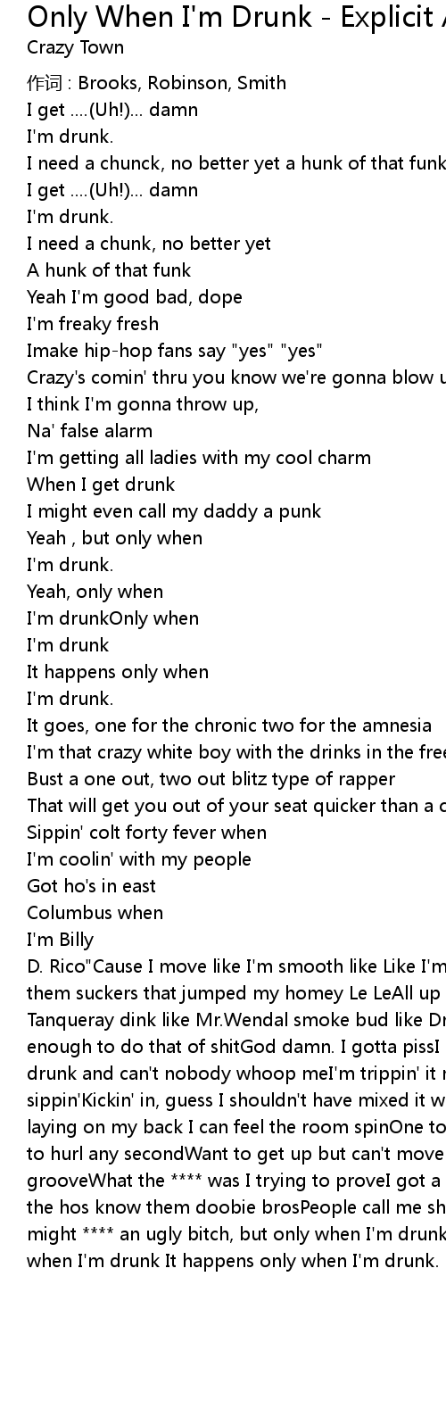 | D. Rico"Cause I move like I'm smooth like Like I'm Harry BelafonteLookin' for them suckers that jumped my homey Le LeAll up in this bitchwith the Gin and Tanqueray dink like Mr.Wendal smoke bud like Dr Dre.But that's cause I'm old enough to do that of shitGod damn. I gotta pissI pass the mic to Mr. Shift.I get drunk and can't nobody whoop meI'm trippin' it must be that brew that Iwas sippin'Kickin' in, guess I shouldn't have mixed it with the Gin'Cause when I'm laying on my back I can feel the room spinOne too many, I reckon Feelin' I got to hurl any secondWant to get up but can't moveFeels like I'm stuck in a grooveWhat the **** was I trying to proveI got a knack for downin'' four-o'sAll the hos know them doobie brosPeople call me shift I keep a fifth in my trunkI might **** an ugly bitch, but only when I'm drunk.Yeah, only when I'm drunkOnly when I'm drunk It happens only when I'm drunk. |
