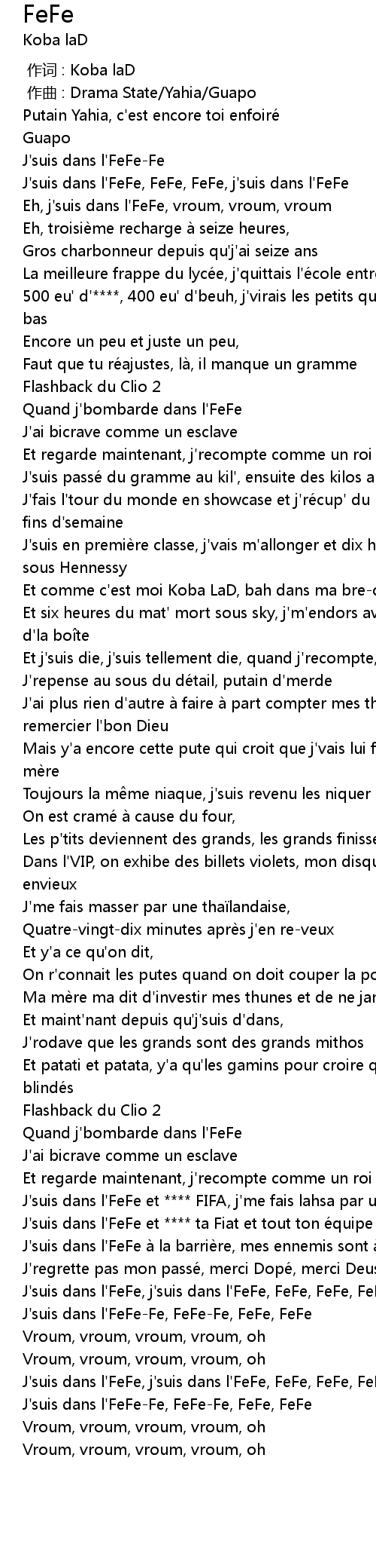 | [02:42.23] | J' suis dans l' FeFe, j' suis dans l' FeFe, FeFe, FeFe, FeFeFe |