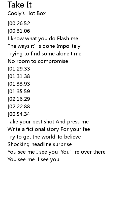 | [01:18.57][00:26.52][00:04.21] | Just take it take it |