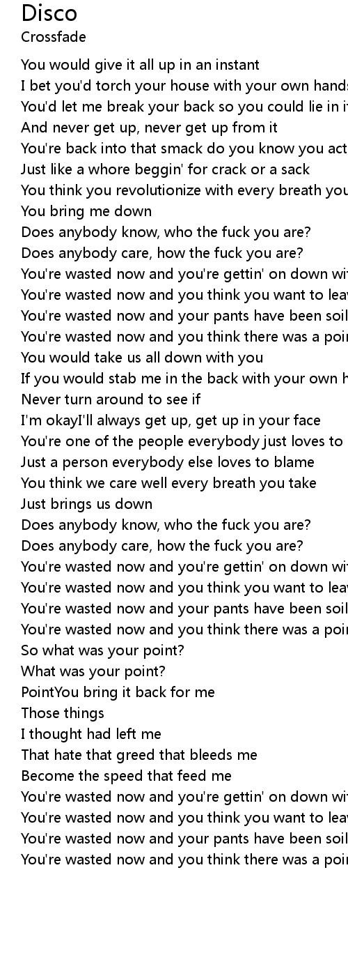 | You're wasted now and your pants have been soiled but you disco | |