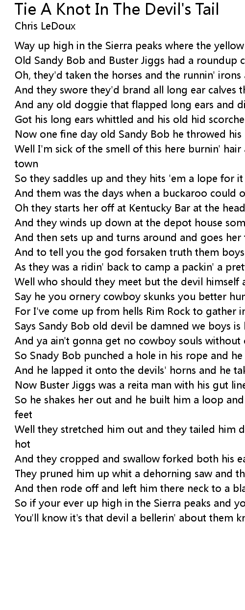 You'll know it's that devil a bellerin' about them knots tied in his tail |