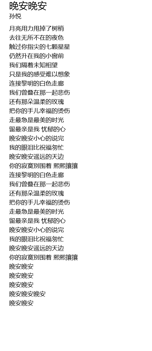 | [04:03.74] | wǎn ān wǎn ān xiǎo xīn de shuō wán |