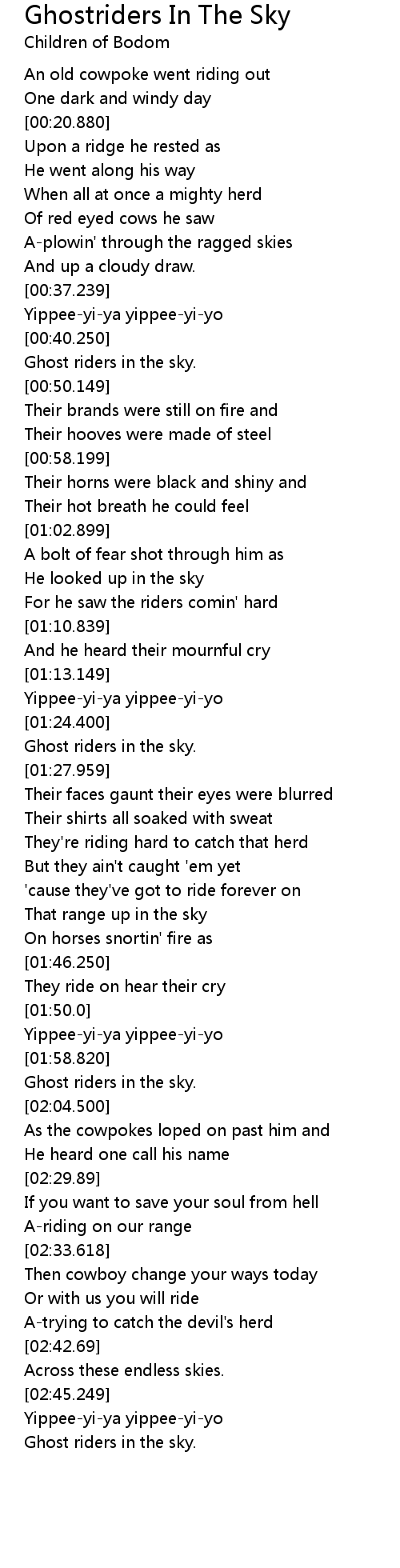 | [02:00.679] | Ghost riders in the sky. |