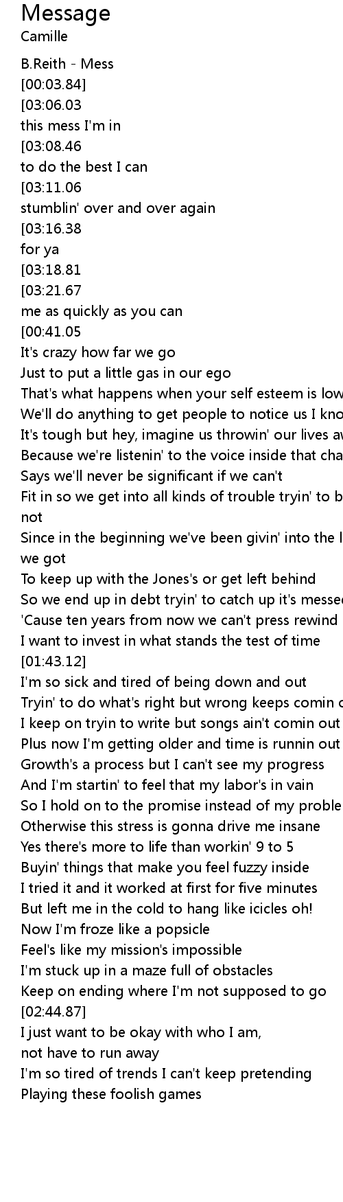 | [03:26.84][03:06.03][02:24.90][01:23.15][00:20.81][00:10.42] | Somebody get me out this mess I'm in |