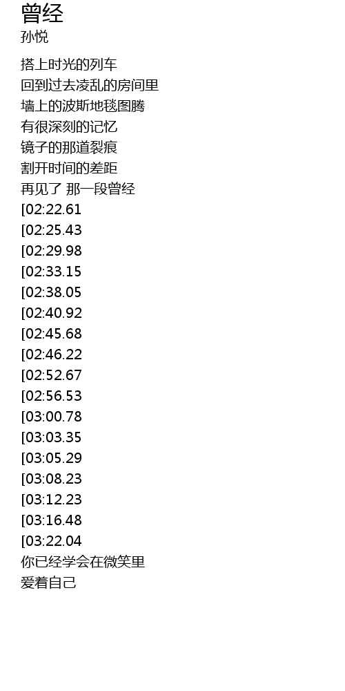 | [01:48.34][03:16.48] | 你已在遗憾的帮助下 |