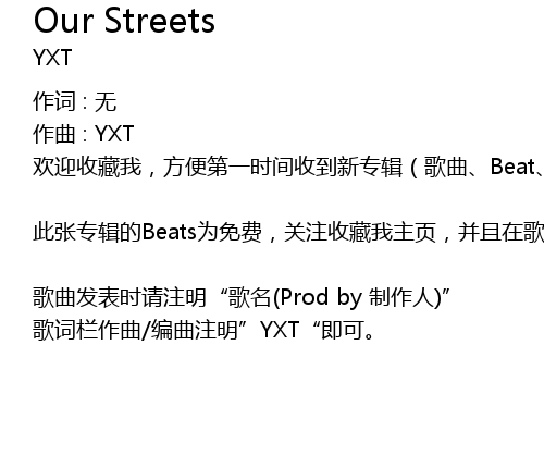 | 歌曲发表时请注明“歌名(Prod by 制作人)” 歌词栏作曲/编曲注明”YXT“即可。 |