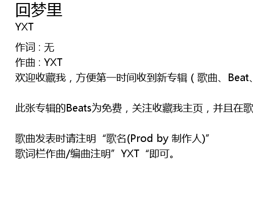 | 歌曲发表时请注明“歌名(Prod by 制作人)” 歌词栏作曲/编曲注明”YXT“即可。 |